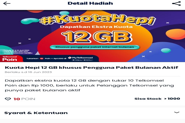 Ekstra Kuota hepi 12GB Rp 1 Ribu Dan Tambah 10 Poin Telkomsel 15 - 16 Juni 2023 kamu bisa mendapatkan Kuota Hepi 12GB Telkomsel Berlaku 24 Jam agar bisa tukar paket Telkomsel Kuota Hepi kamu harus memiliki poin Telkomsel walaupun pulsa kamu banyak tidak memiliki poin sama saja tidak bisa menikmati Paket Ekstra Kuota Hepi 12GB Telkomsel.
